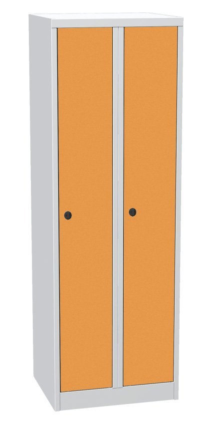 Two-part welded wardrobe height 1800 x width 600 x depth 493 mm. Locking with a cylinder lock with two keys or a rotary lock for a padlock. Body color light gray, HPL laminate door in blue, light green or light orange pattern. There is a bend in each compartment to prevent the door from being pushed into the cabinet and the lock from being pryed open.