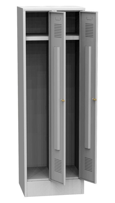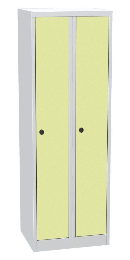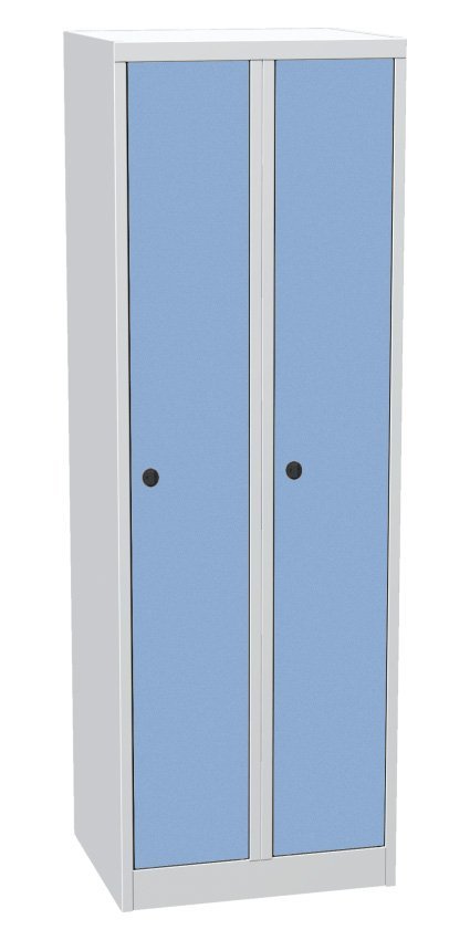 Two-part welded wardrobe height 1800 x width 600 x depth 500 mm. Locking with a cylinder lock with two keys or a rotary lock for a padlock. Body color light gray, laminate doors beech, birch or cherry. There is a bend in each compartment to prevent the door from being pushed into the cabinet and the lock from being pryed open.