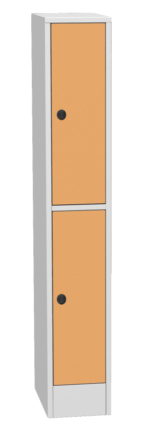 Two-door metal wardrobe divided, width 300, height 1850, depth 493 mm. Metal body in light gray RAL 7035, HPL laminate door in blue, light green or light orange pattern. Cylinder lock with two keys or padlock closure. Internal equipment of each department - bar with three sliding hooks.