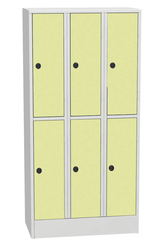 Six-door metal wardrobe divided, width 900, height 1850, depth 493 mm. Metal body in light gray RAL 7035, HPL laminate door in blue, light green or light orange pattern. Cylinder lock with two keys or padlock closure. Internal equipment of each department - bar with three sliding hooks.