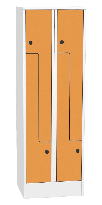Two-door metal wardrobe divided, width 300, height 1850, depth 493 mm. Metal body in light gray RAL 7035, HPL laminate door in blue, light green or light orange pattern. Cylinder lock with two keys or padlock closure.
