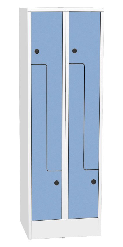Four-door metal wardrobe divided, width 600, height 1850, depth 493 mm. Metal body in light gray RAL 7035, HPL laminate door in blue, light green or light orange pattern. Cylinder lock with two keys or padlock closure.