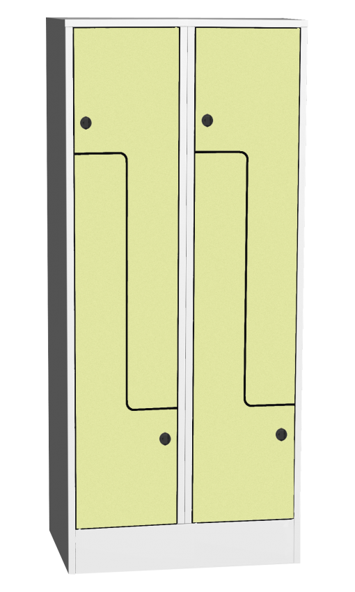 Two-door metal wardrobe divided, width 300, height 1850, depth 493 mm. Metal body in light gray RAL 7035, HPL laminate door in blue, light green or light orange pattern. Cylinder lock with two keys or padlock closure.