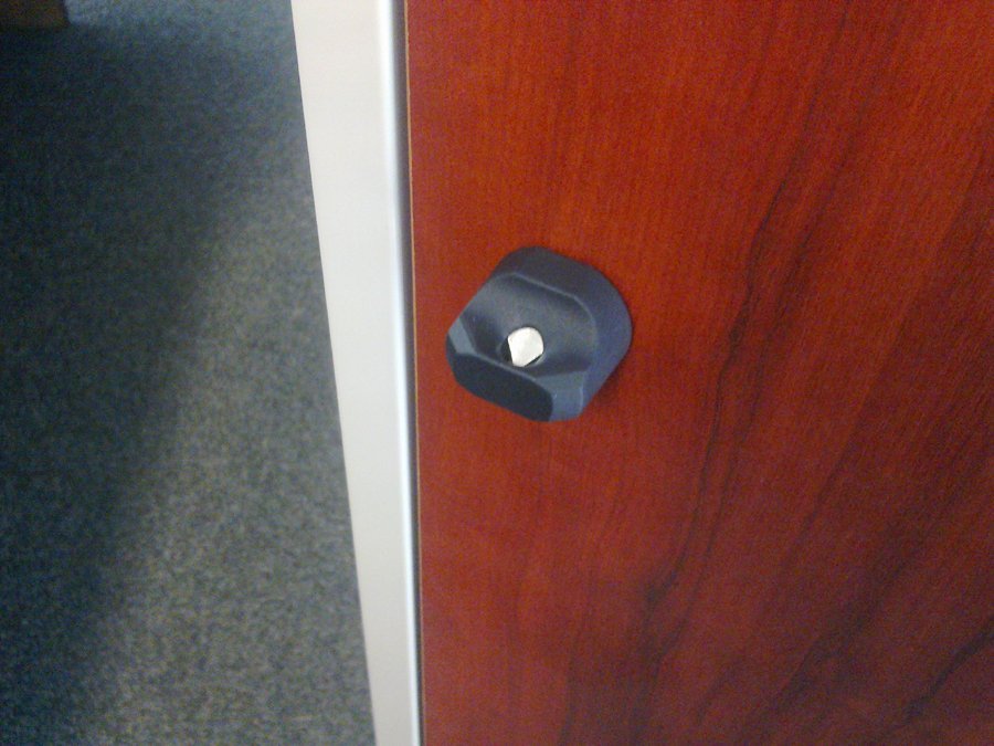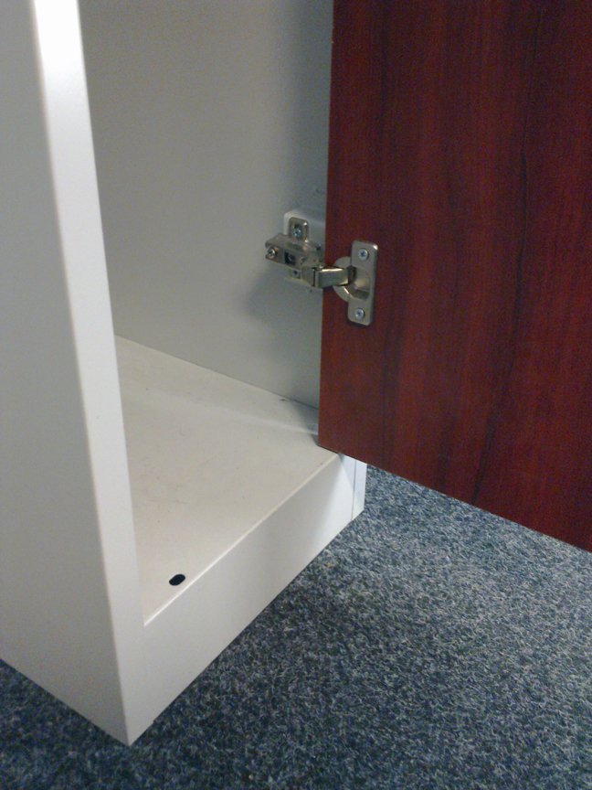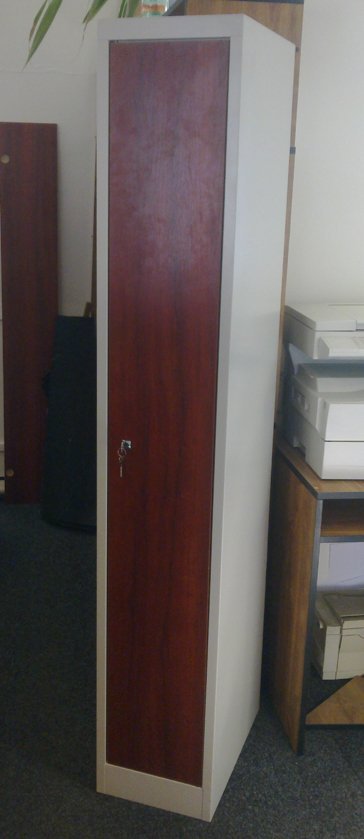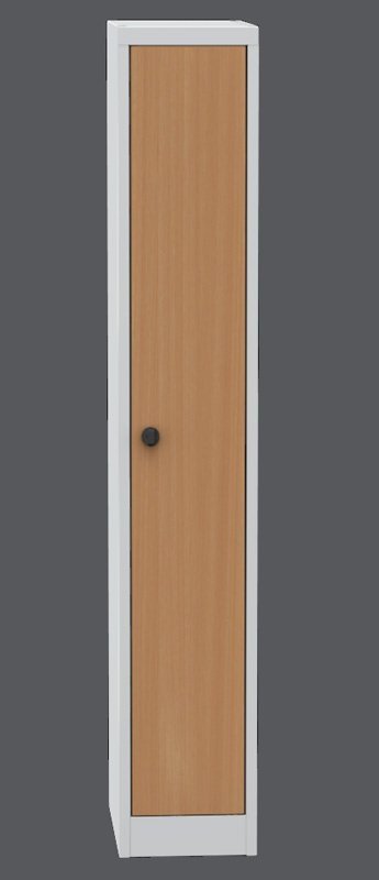 One-compartment welded wardrobe with compartment width 300 mm, height 1800 mm, depth 500 mm. Locking with a cylinder lock with two keys or a rotary lock for a padlock. Body color light gray, laminate doors beech or cherry. There is a bend in each compartment to prevent the door from being pushed into the cabinet and the lock from being pryed open.