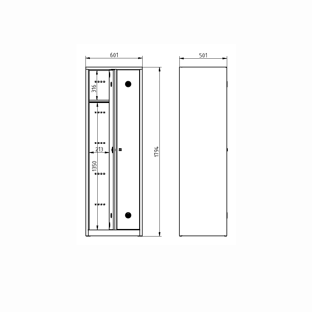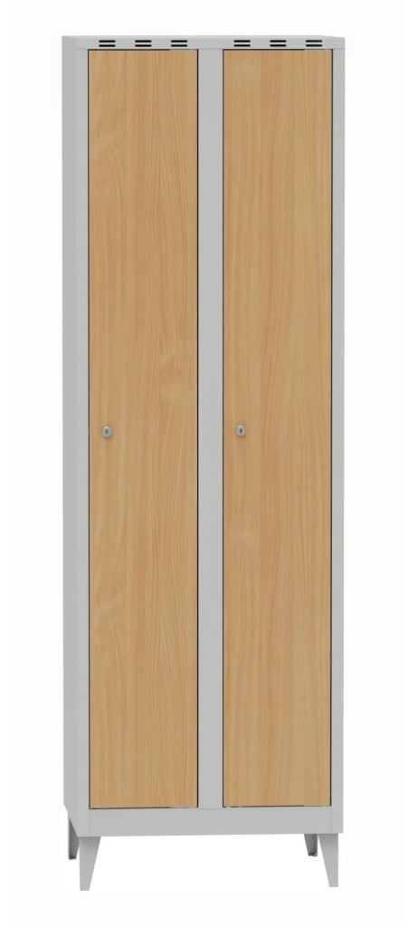 Metal wardrobe with laminate doors in beech pattern. Height 1800 x width 800 x depth 500 mm, 2 compartments. Key locking or padlock closure. Supplied on a plinth or on legs (in this case the height of the cabinet is increased by 150 mm). Body color light gray RAL 7035.