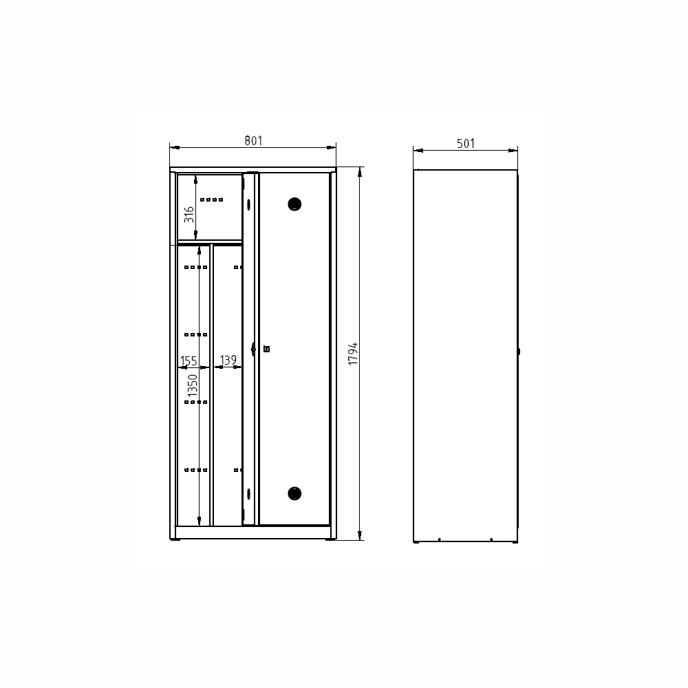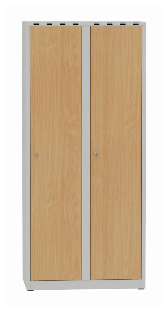 Metal wardrobe with laminate doors in beech pattern. Height 1800 x width 800 x depth 500 mm, 2 compartments. Key locking or padlock closure. Supplied on a plinth or on legs (in this case the height of the cabinet is increased by 150 mm). Body color light gray RAL 7035.