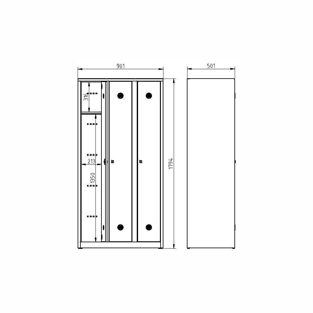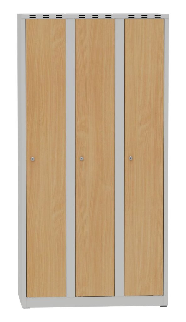 Metal wardrobe with laminate doors in beech pattern. Height 1800 x width 600 x depth 500 mm, 2 compartments. Key locking or padlock closure. Supplied on a plinth or on legs (in this case the height of the cabinet is increased by 150 mm). Body color light gray RAL 7035.