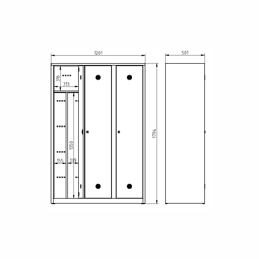 Metal divided wardrobe with laminate doors in beech pattern. Height 1800 x width 600 x depth 500 mm, 4 compartments. Key locking or padlock closure. Supplied on a plinth or on legs (in this case the height of the cabinet is increased by 150 mm). Body color light gray RAL 7035.