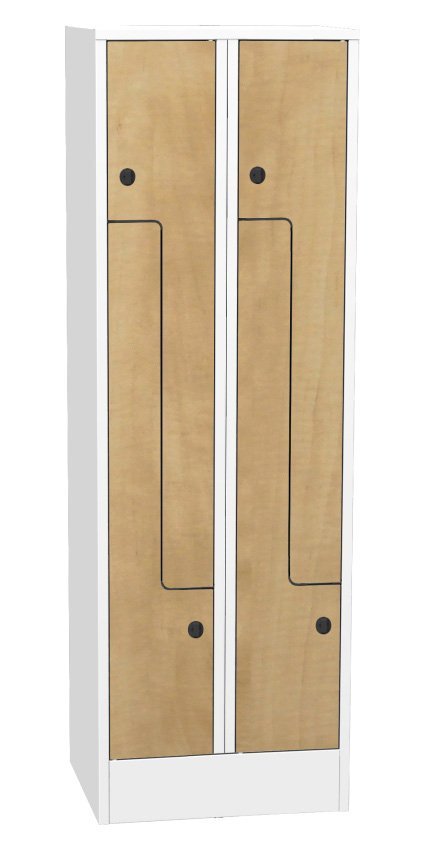 Two-door metal wardrobe divided, width 300, height 1850, depth 500 mm. Metal body in light gray RAL 7035, laminate door in beech, birch or cherry pattern. Cylinder lock with two keys or padlock closure.