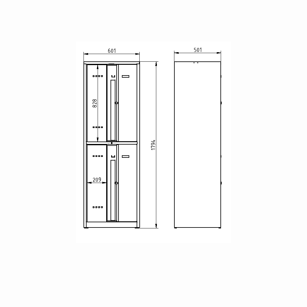 Metal cabinet with lockable boxes, height 1800 x width 800 x depth 500 mm. Key locking or padlock closure. Body color RAL 7035 light gray.