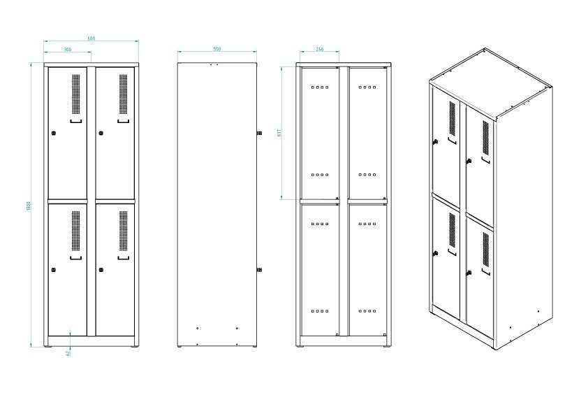 Standing bench under wardrobes 2x 300 mm or 1x 600 mm wide. Height 370, width 600, depth 800 mm. All wardrobes with a plinth of 500 mm depth and corresponding width can be placed on the benches.