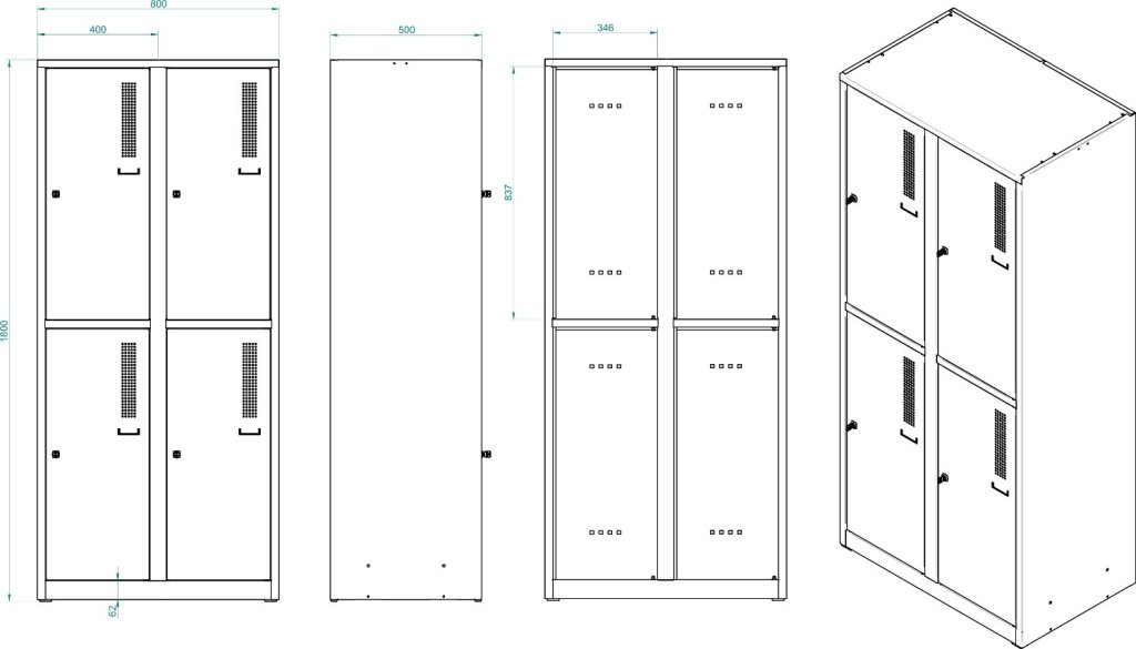 Metal wardrobe divided on plinth, height 1800 x width 800 x depth 500 mm. Key locking. Body color RAL 7035 light gray, door color full description and parameters