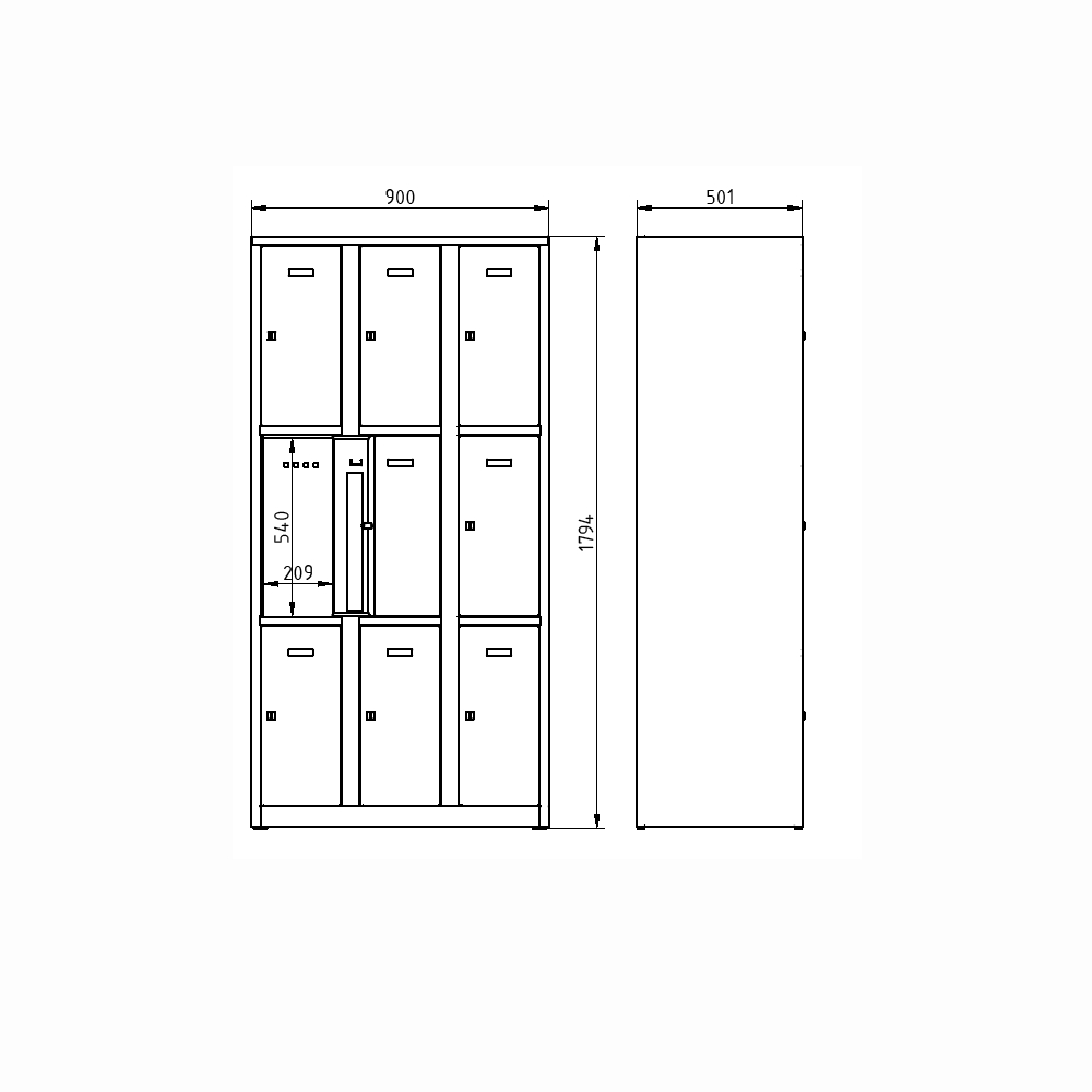 Metal wardrobe divided on plinth, height 1800 x width 900 x depth 500 mm. Key locking. Body color RAL 7035 light gray, door color full description and parameters