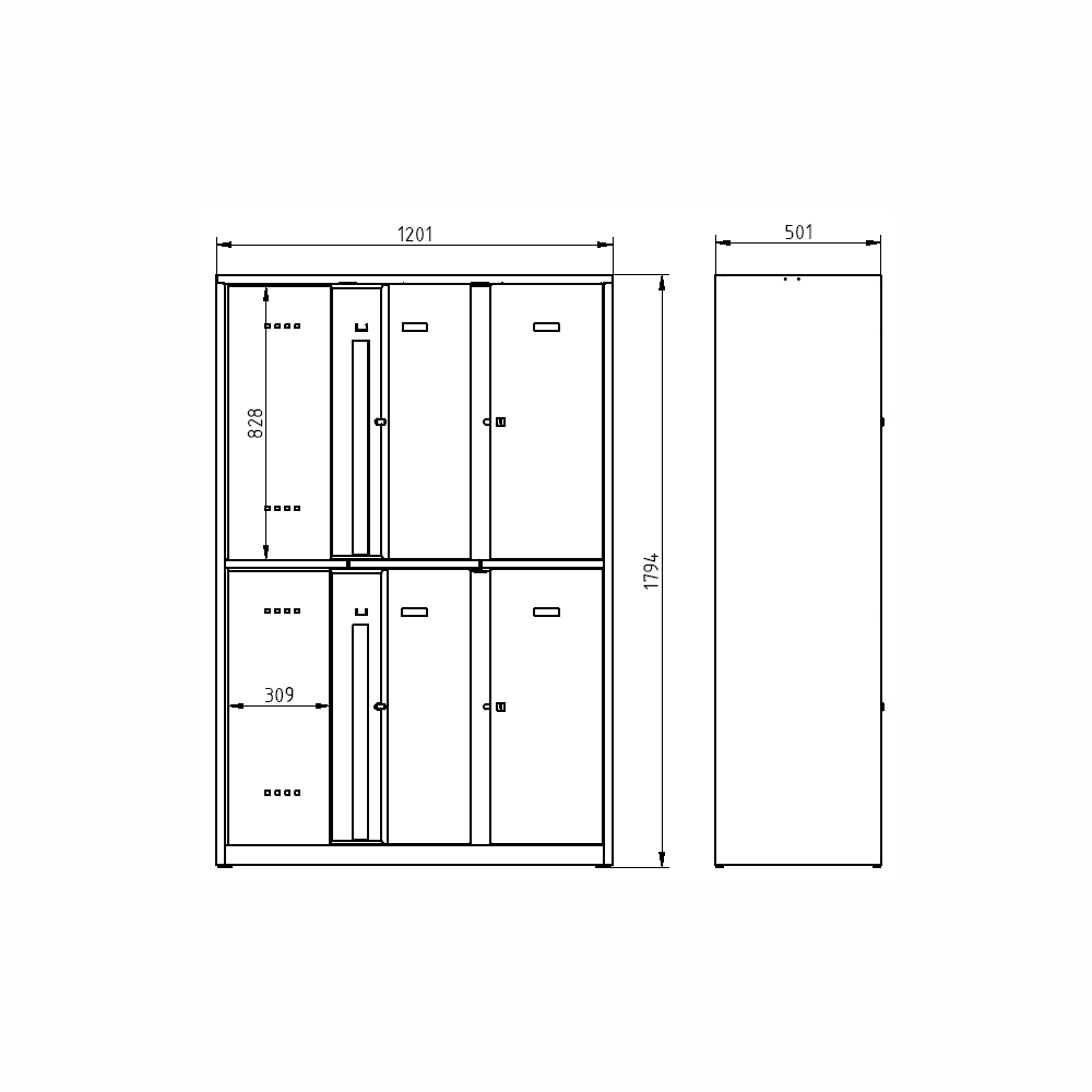 Metal cabinet with lockable boxes, height 1800 x width 800 x depth 500 mm. Key locking or padlock closure. Body color RAL 7035 light gray.