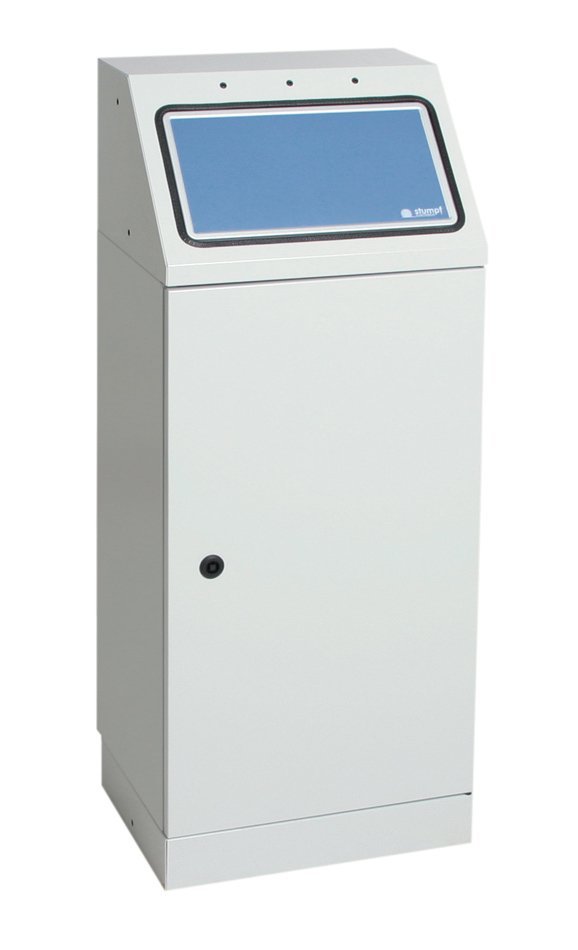 Metal waste bin with dimensions - height 1000 x width 400 x depth 300 mm. The entire structure has a galvanized surface. The closure has robust protectors in 3 colors for distinction. The flap is self-closing and odor-resistant. The basket has a lockable door in the front and a removable inner basket of 45 l. Two adjustable feet to compensate for uneven floors.