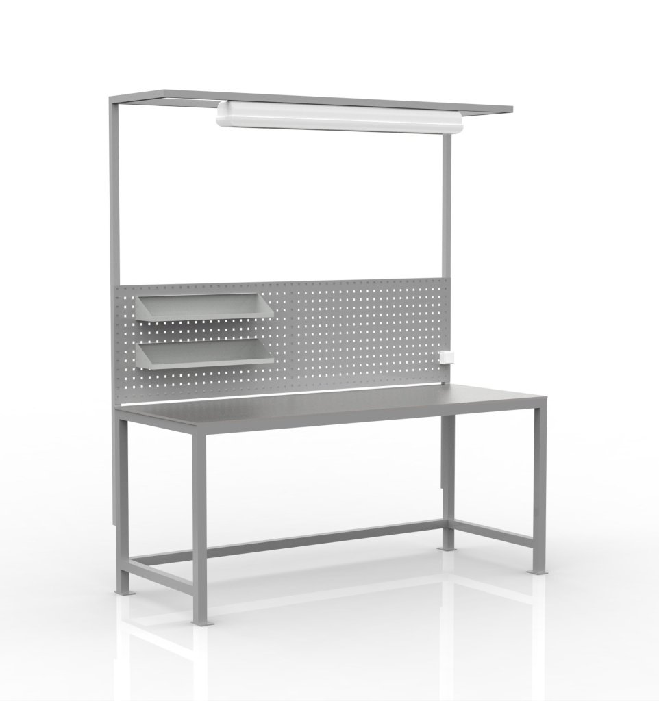 Workshop table with perforated panel from the tubular modular system. The table includes a laminate worktop, a perforated panel with dimensions of 1117 x 393 mm and four adjustable legs. Load capacity with a uniform load of 100 kg. Dimensions 1282 x 1200 x 750 mm.