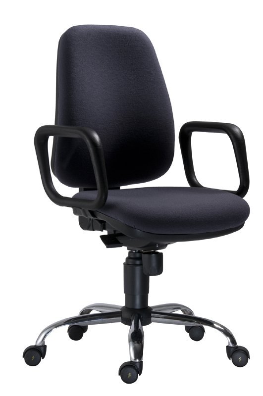 Office work chair with polyurethane armrests, designed to dissipate static electricity from the workplace with the presence of electronic components and volatile chemicals. All parts of the chair, including special fabric and wheels, are conductive, specific resistance less than 0.1 MΩ, shade of cover - dark gray (anthracite), chrome cross, load capacity 130 kg. Price without armrests.