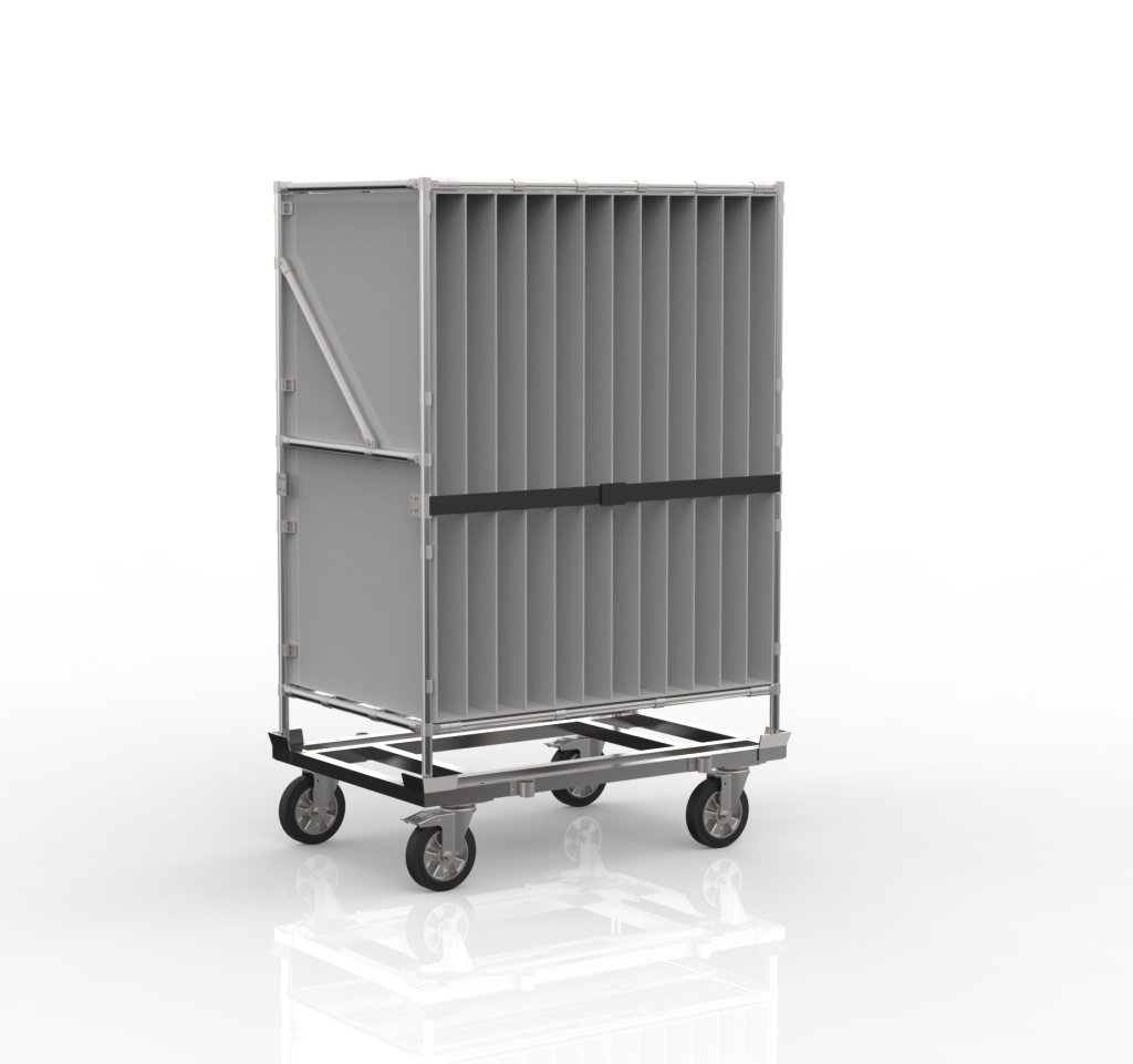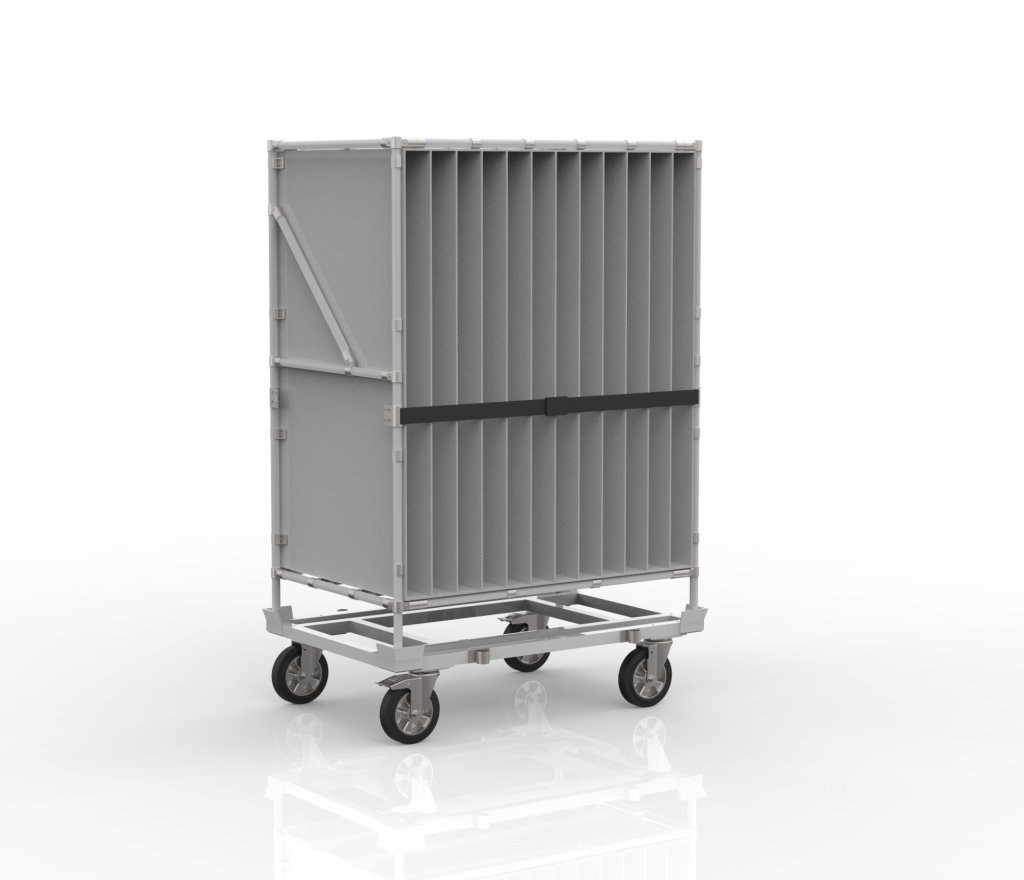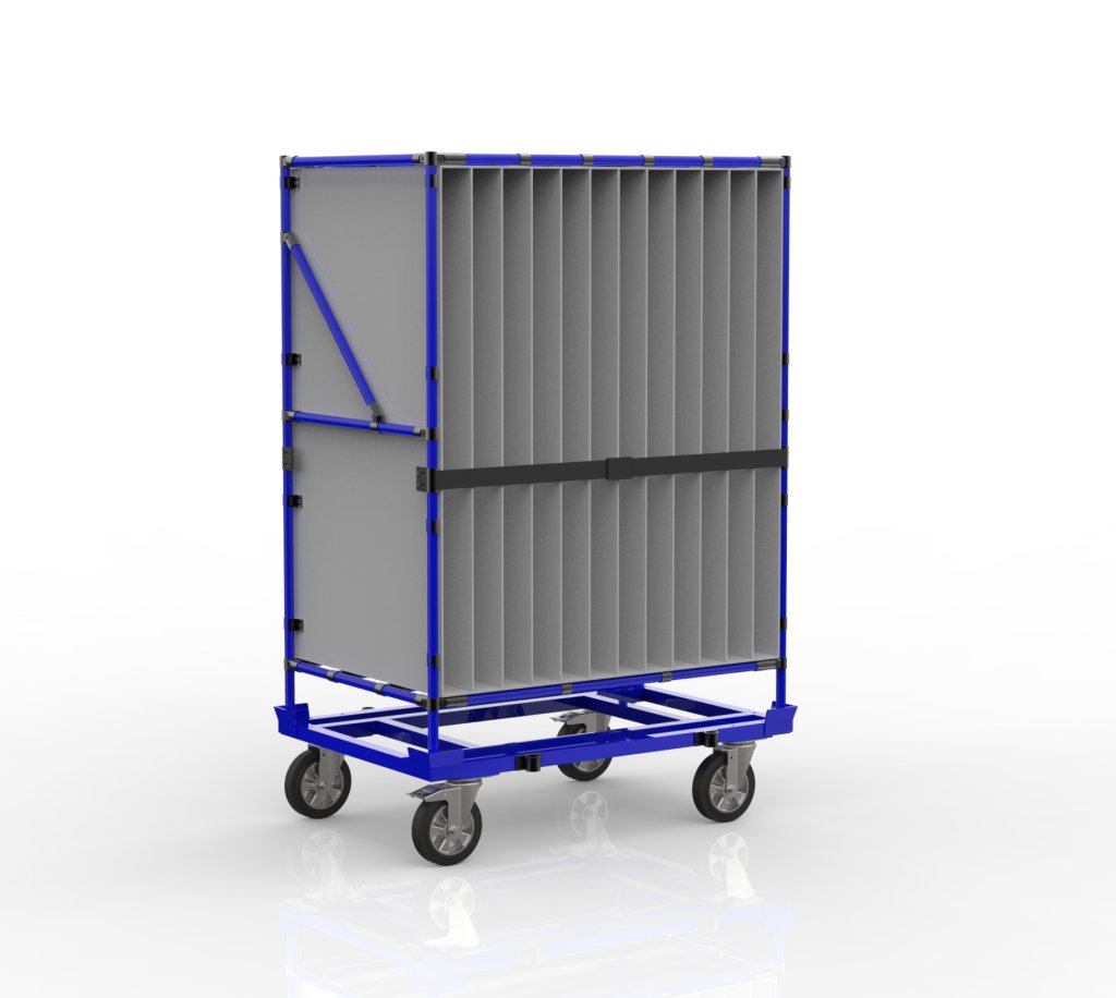 Welded trolley with a tubular system extension and two shelves. The base of the trolley consists of a welded steel frame with a galvanized surface, and the extension is made of a tubular modular system with a laminated PP insert featuring a removable bottom in each compartment. For securing stored materials, strap fasteners with loops on each side are used. The trolley also includes two swivel wheels with brakes and two swivel wheels without brakes, each with a diameter of 200 mm. Load capacity of the trolley: 240 kg. Shelf load capacity: 120 kg. Dimensions: 1883 x 1203 x 803 mm.