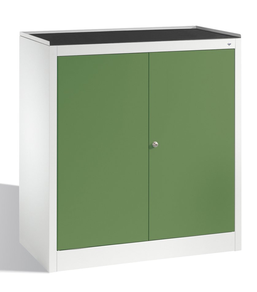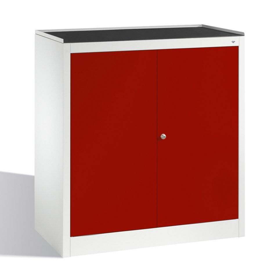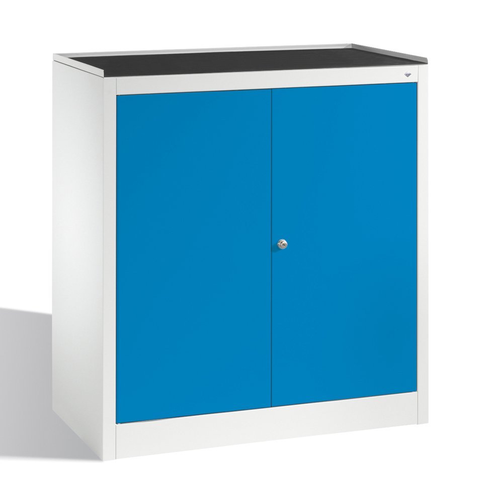 Two-door workshop cabinet with durable steel construction. 1x adjustable galvanized shelf, load capacity 70 kg/shelf. On the upper part of the cabinet there is a corrugated rubber pad. Cylindrical safety lock with handle. Available dimensions in mm (H x W x D) 1000 x 930/1200 x 500.