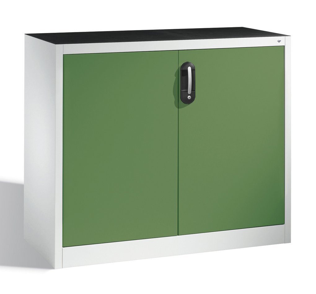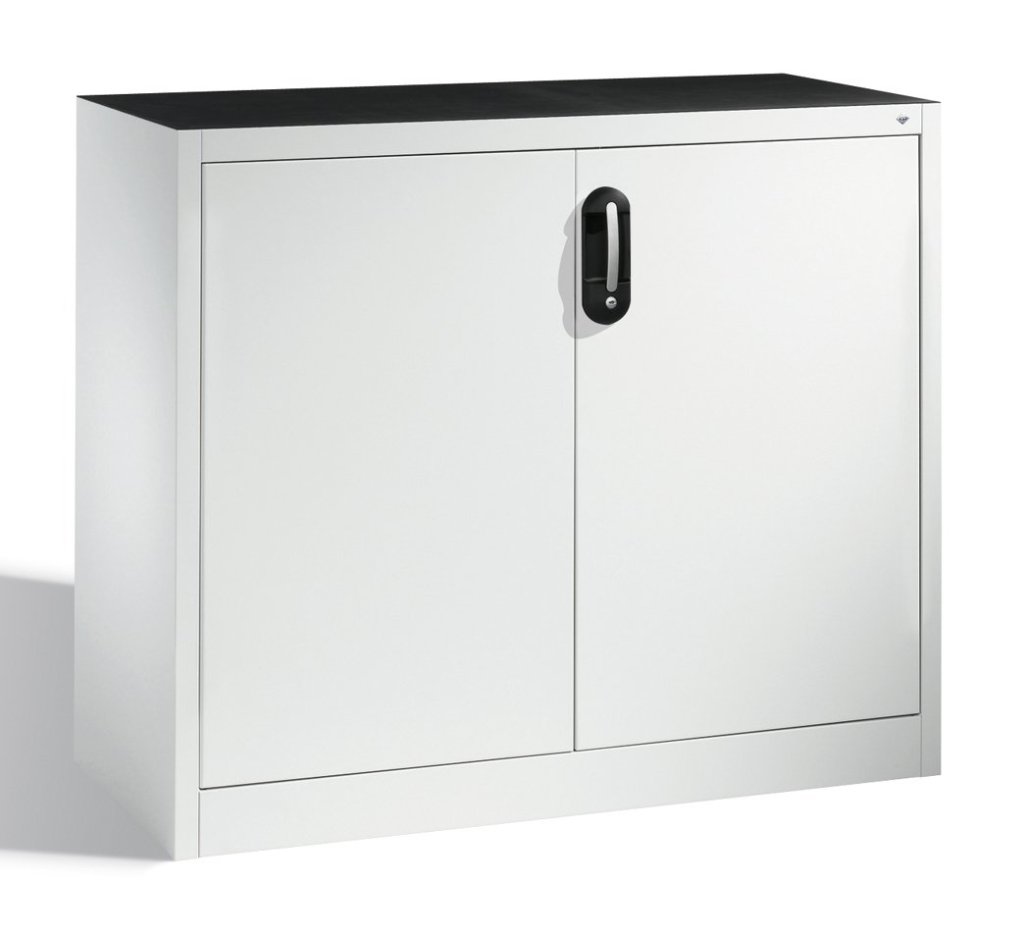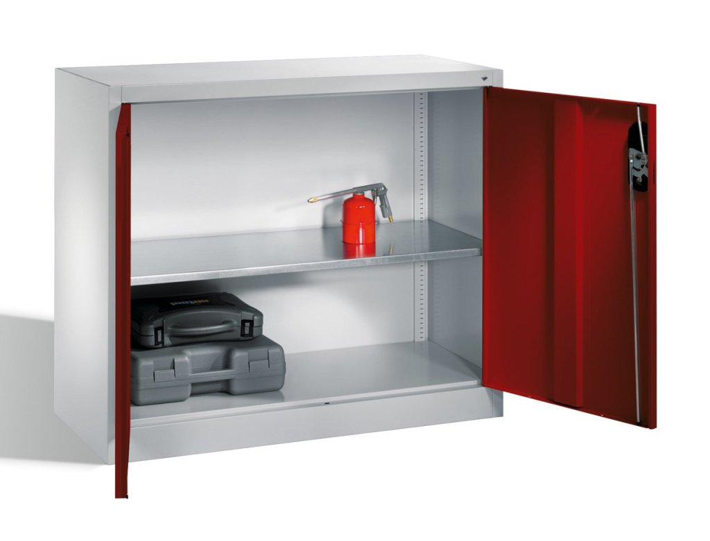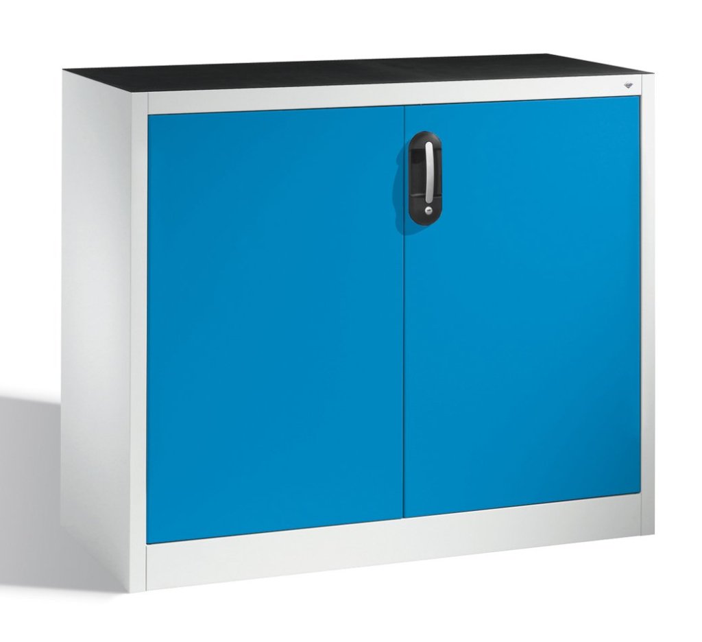Cabinet with hinged doors, 2 x shelves adjustable in 25mm increments (galvanized), full door with reinforcements for perfo, load capacity 300 kg. Height 1000 x width 1044 x depth 655 mm. In stock in body color light gray RAL 7035, doors blue RAL 5012.