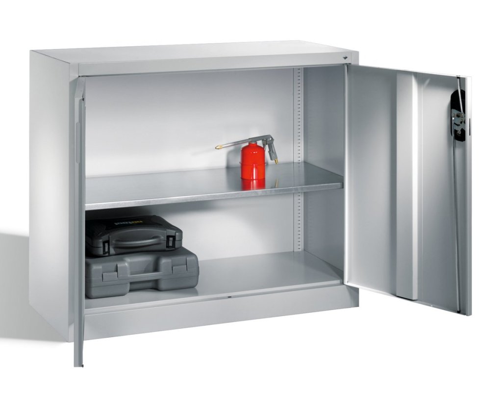 Cabinet with hinged doors, 2 x shelves adjustable in 25 mm increments (galvanized), full door with reinforcements for perforation, load capacity 300 kg. Height 1000 x width 1044 x depth 405 mm.
