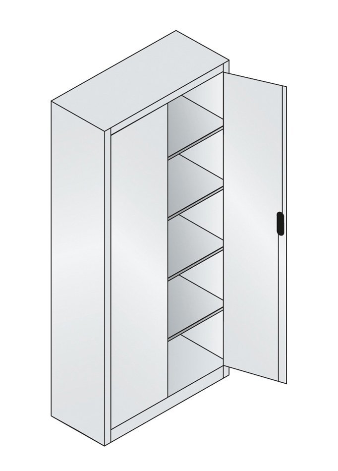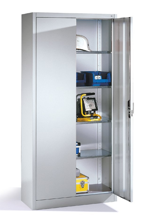 Two-door workshop cabinet with durable steel construction. 4 adjustable galvanized shelves, load capacity 70 kg/shelf. Cylindrical safety lock with handle. Available dimensions in mm (H x W x D) 1950 x 930/1200 x 400/500/600.