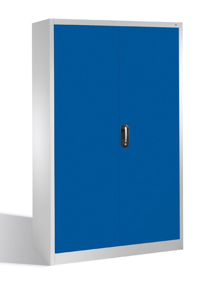 Two-door workshop cabinet, width 950, height 1950, depth 600 mm, 4 shelves. Possibility of replacing solid doors with doors with glass or wire filling. Body color gray RAL 7035. In stock in door color blue RAL 5012.