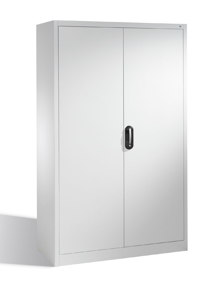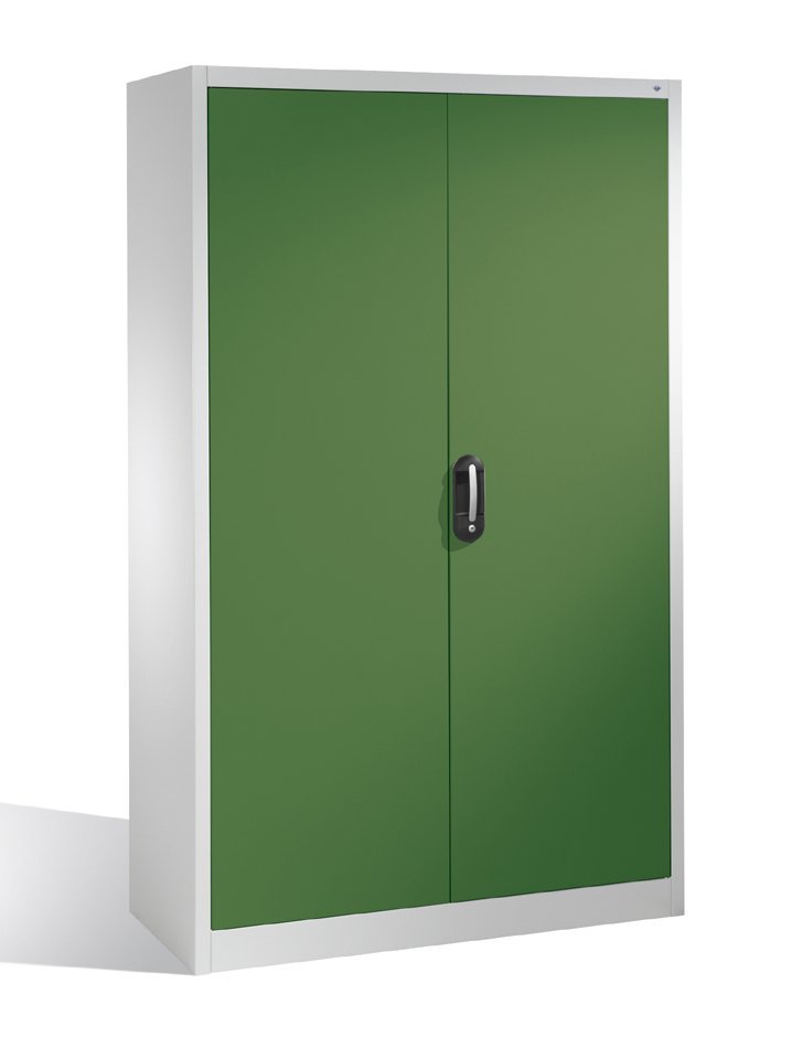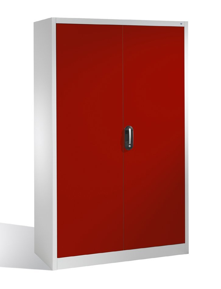 Two-door workshop cabinet with durable steel construction. 4 adjustable galvanized shelves, load capacity 70 kg/shelf. Cylindrical safety lock with handle. Available dimensions in mm (H x W x D) 1950 x 1200 x 400.