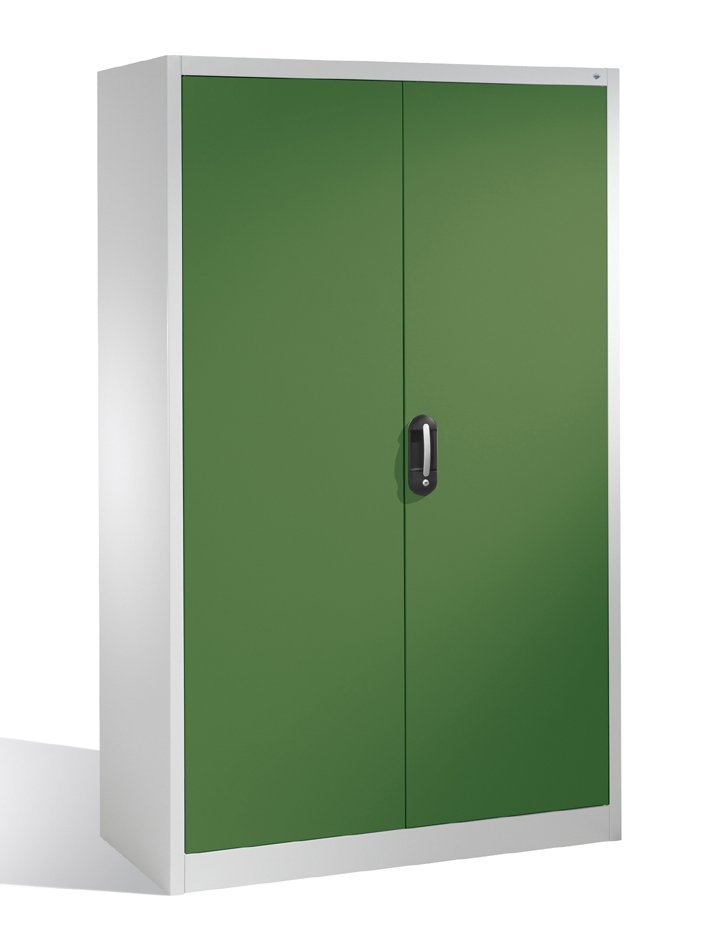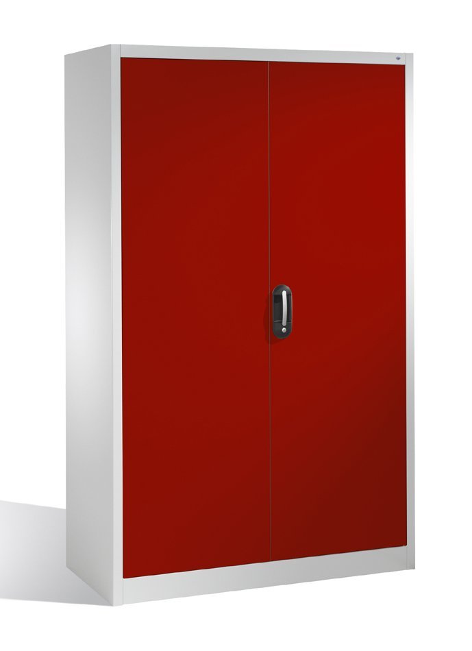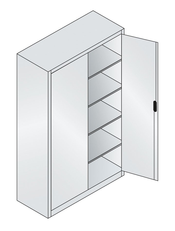 Two-door workshop cabinet with durable steel construction. 4 adjustable galvanized shelves, load capacity 70 kg/shelf. Cylindrical safety lock with handle. Available dimensions in mm (H x W x D) 1950 x 1200 x 500.