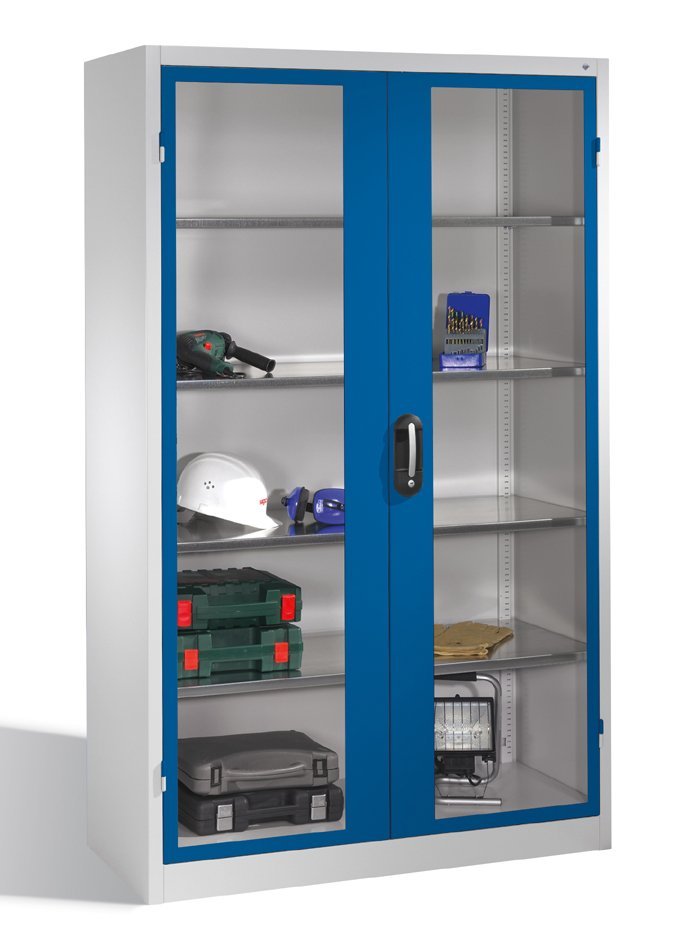 Workshop cabinet with durable steel construction and steel doors with acrylic glass filling. 4 adjustable galvanized shelves, load full description and parameters