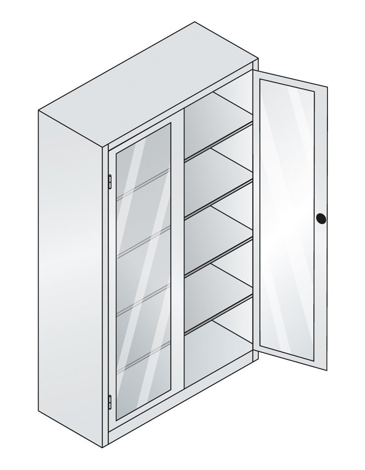 Cabinet with glass doors, height 1150 x width 505 x depth 400 mm. Locking on a cylinder lock with a wheelbase mechanism. 2 x adjustable steel shelves (load capacity 60 kg). Glass doors are made of tempered glass. Possibility of replacing doors with glass filling with doors with wire filling or laminate doors in the shade of beech, birch or cherry. Body color RAL 7035 light gray.
