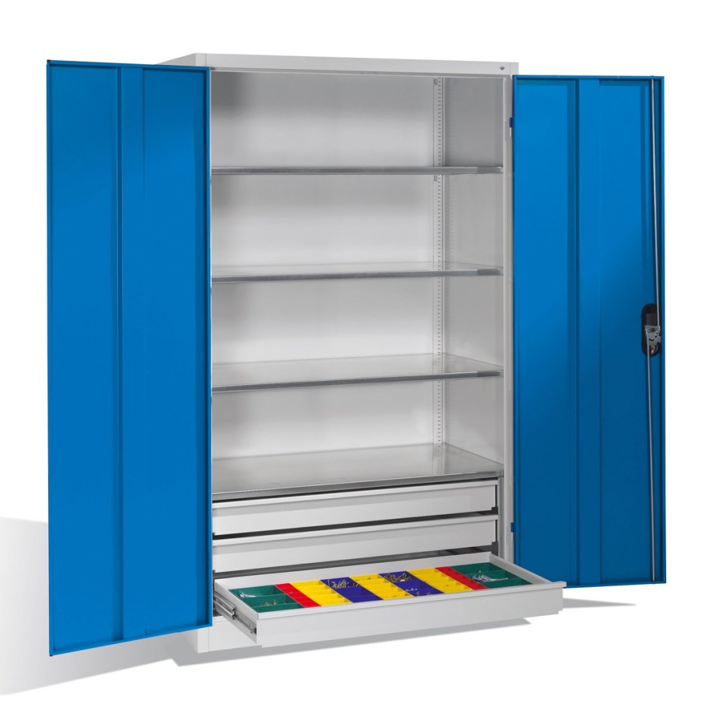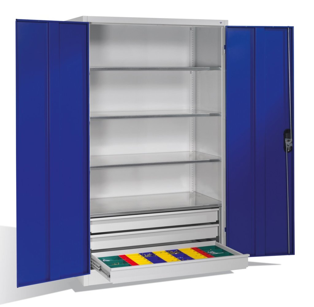 Two-door workshop cabinet, width 950, height 1950, depth 600 mm, 2 shelves, 2 drawers. Possibility of replacing solid doors with doors with glass or wire filling. Body color RAL 7035 light gray.