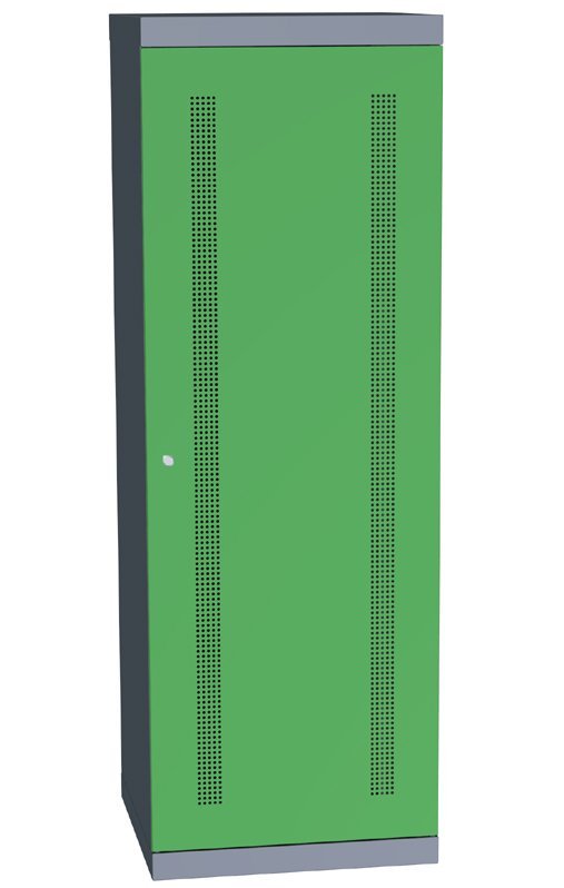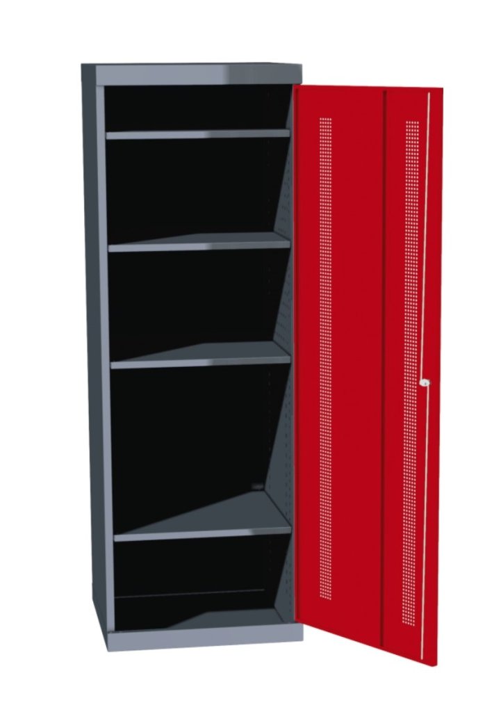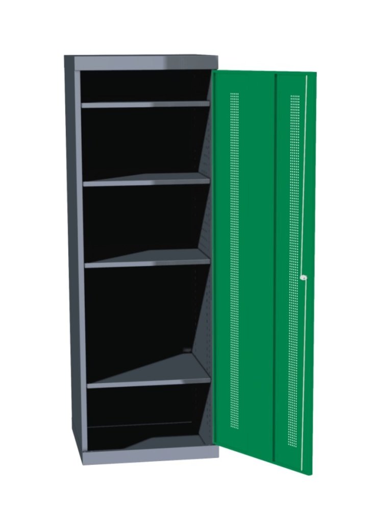 Economy one-door workshop cabinet. Height 1800 x width 620 x depth 600 mm, 4 adjustable shelves. Body color gray RAL 7031, door color green RAL 6001, blue RAL 5012, red RAL 3000 or yellow RAL 1023.