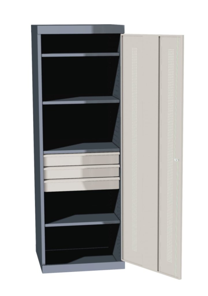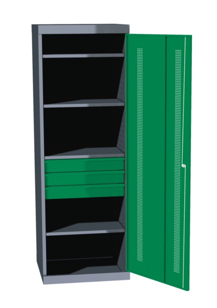 Economy one-door workshop cabinet. Height 1800 x width 620 x depth 600 mm, 4 adjustable shelves, 3 drawers. Body color gray RAL 7031, door color green RAL 6001, blue RAL 5012, red RAL 3000, light gray RAL 7035 or yellow RAL 1023.