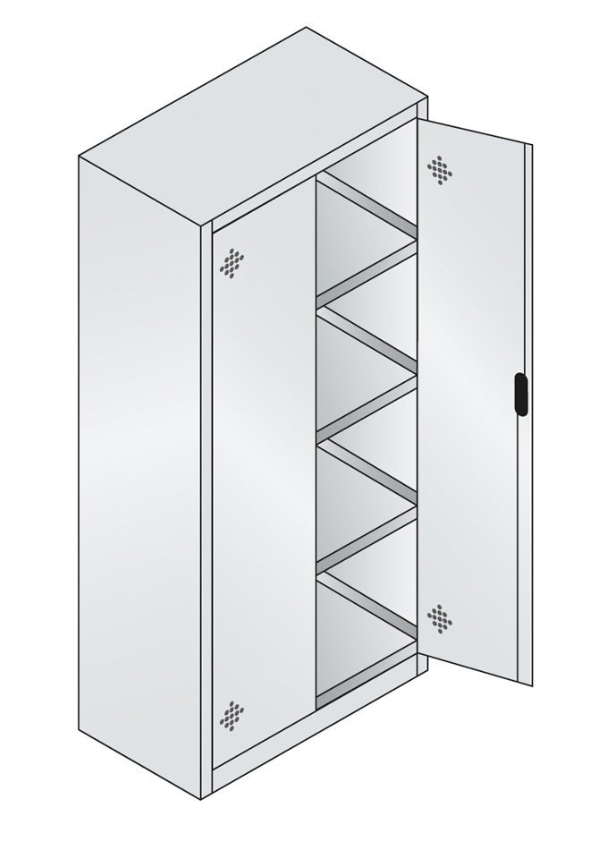 Cabinet for storing chemicals with trays for collecting liquids. The cabinet is equipped with 4 adjustable shelves in the shape of a tray with a robust perforated galvanized grid and one deeper tray at the bottom of the cabinet without a grid. Height 1950 x width 950 x depth 500 mm, shelf load capacity 60 kg, body load capacity 300 kg. In stock in body color gray RAL 7035, door color RAL 1023.