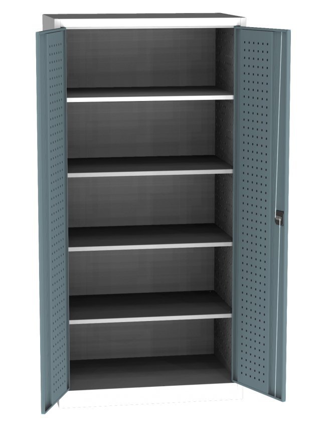 Two-door workshop cabinet, width 950, height 1950, depth 600 mm, 4 shelves. Possibility of replacing solid doors with doors with glass or wire filling. Body color gray RAL 7035. In stock in door color blue RAL 5012.