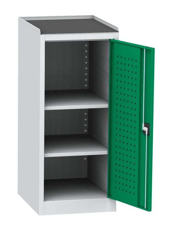 One-door workshop cabinet, width 505, height 1180, depth 600 mm, 2 shelves. Option to replace solid doors with a frame with tempered glass or a wire mesh for a better overview of the contents of the cabinet. Body capacity 800 kg, shelf capacity 100 kg. Body color RAL 7035 light gray.