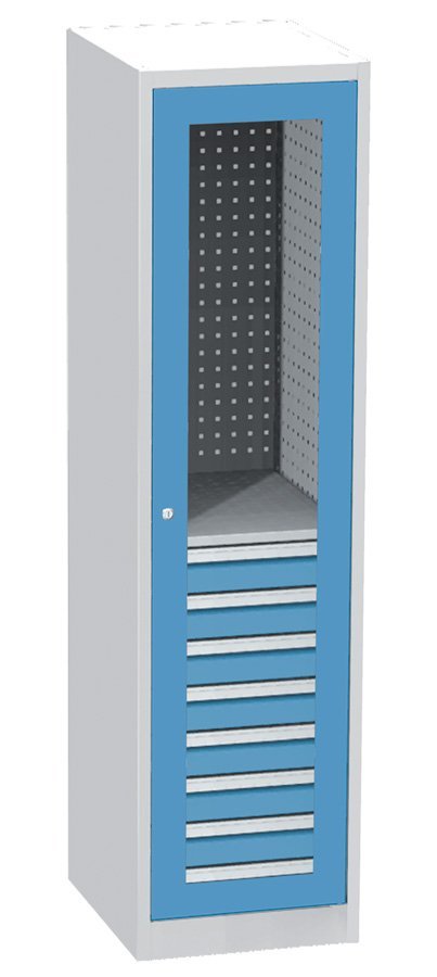 One-door workshop cabinet with glass door in steel frame, width 505, height 1950, depth 600 mm, 1 shelf, 8 drawers. Body capacity 800 kg, shelf capacity 100 kg, drawer capacity 50 kg. Body color RAL 7035 light gray.