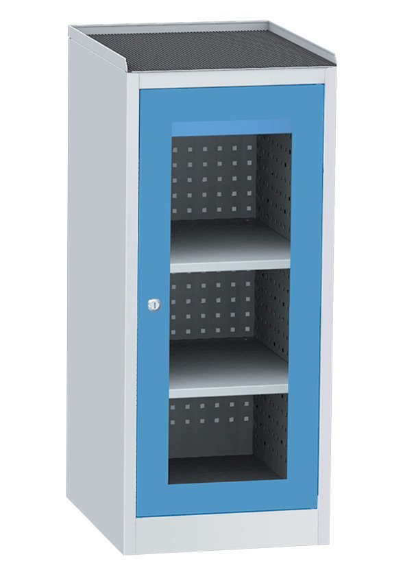 Two-door workshop cabinet with glass doors in a steel frame, width 505, height 1180, depth 600 mm, 2 shelves, 1 drawer. Body capacity 800 kg, drawer capacity 50 kg, shelf capacity 100 kg. Body color RAL 7035 light gray.