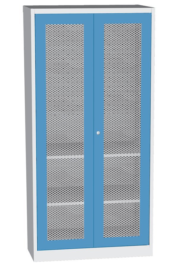 Two-door workshop cabinet with wire doors in a steel frame, width 950, height 1950, depth 600 mm, 2 shelves. Body color RAL 7035 full description and parameters