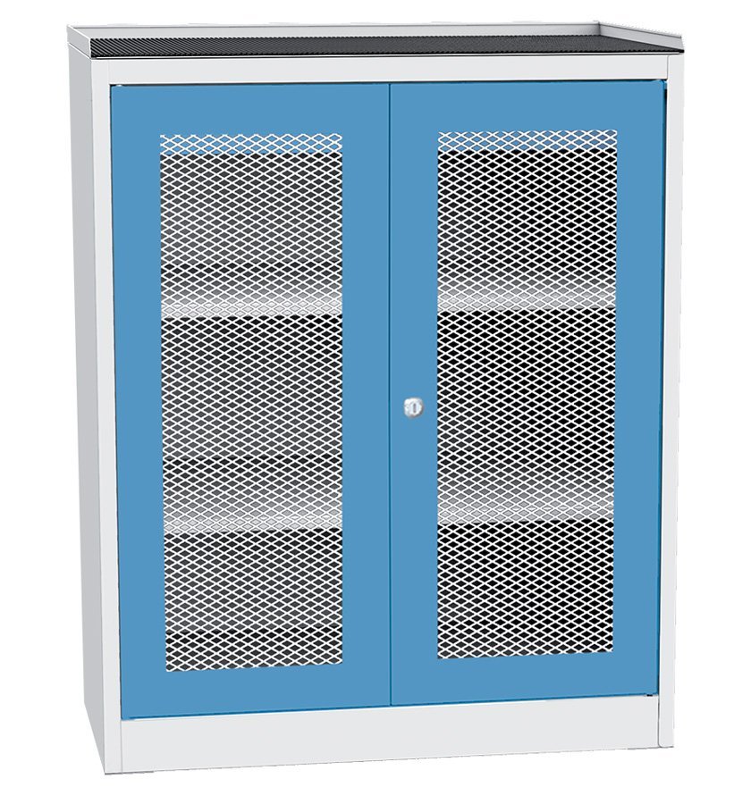 Two-door workshop cabinet with wire doors in a steel frame, width 950, height 1180, depth 600 mm, 2 shelves, 1 drawer. Body capacity 800 kg, drawer capacity 50 kg, shelf capacity 100 kg. Body color RAL 7035 light gray.