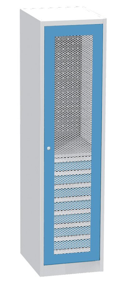 One-door workshop cabinet with wire door in steel frame, width 505, height 1950, depth 600 mm, 1 shelf, 8 drawers. Body capacity 800 kg, shelf capacity 100 kg, drawer capacity 50 kg. Body color RAL 7035 light gray.