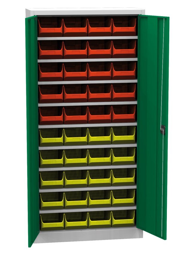 Two-door workshop cabinet with plastic boxes (45), width 950, height 1950, depth 400 mm. 9 x shelves, 25 x plastic box 456209 (w.150 x h.125 x d.235 mm), 20 x plastic box 456214 (w.205 x h.150 x d.352 mm). Possibility of replacing solid doors with doors with glass or wire filling. Body color RAL 7035 light gray.