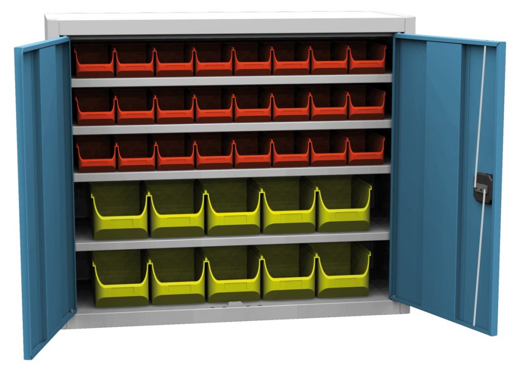 Two-door workshop cabinet with plastic boxes (60), width 750, height 1650, depth 300 mm. 11 x shelves, 36 x Small plastic box (w.110 x h.75 x d.165 mm), 24 x Medium plastic box (w.155 x h.125 x d.240 mm). Possibility of replacing solid doors with doors with glass or wire filling. In stock in light gray body, blue solid doors, blue and red boxes.