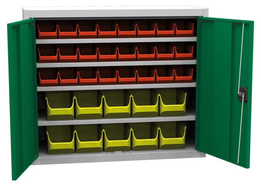 Two-door workshop cabinet with plastic boxes (45), width 950, height 1950, depth 400 mm. 9 x shelves, 25 x plastic box 456209 (w.150 x h.125 x d.235 mm), 20 x plastic box 456214 (w.205 x h.150 x d.352 mm). Possibility of replacing solid doors with doors with glass or wire filling. Body color RAL 7035 light gray.