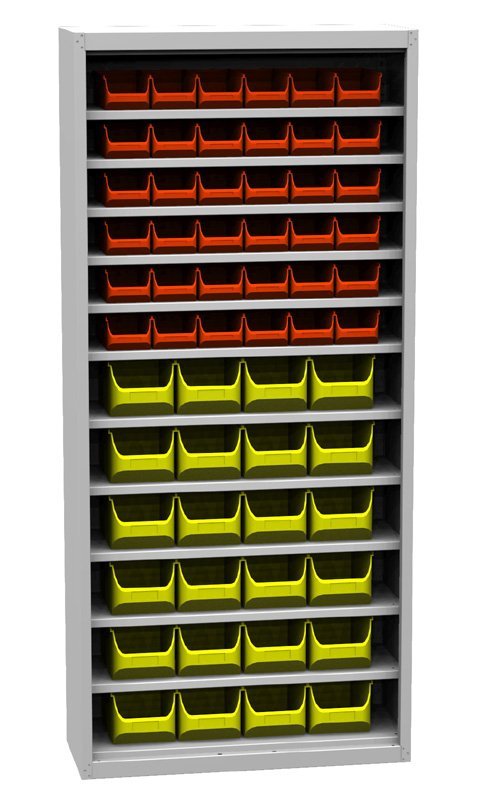 Two-door workshop cabinet with plastic boxes (60), width 750, height 1650, depth 300 mm. 11 x shelves, 36 x Small plastic box (w.110 x h.75 x d.165 mm), 24 x Medium plastic box (w.155 x h.125 x d.240 mm). Possibility of replacing solid doors with doors with glass or wire filling. In stock in light gray body, blue solid doors, blue and red boxes.