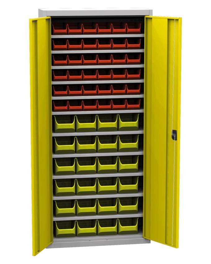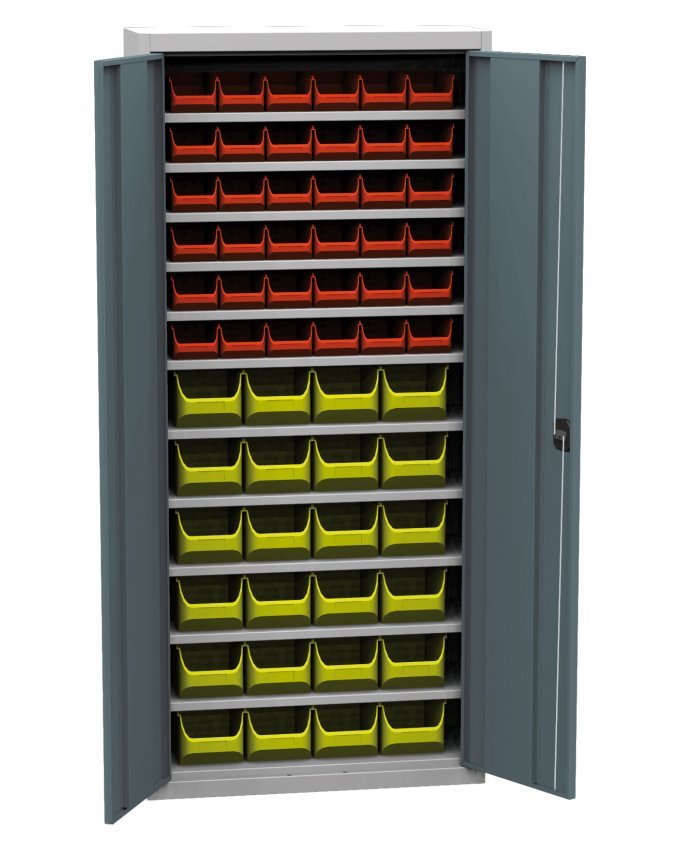 Two-door workshop cabinet with plastic boxes (60), width 750, height 1650, depth 300 mm. 11 x shelves, 36 x Small plastic box (w.110 x h.75 x d.165 mm), 24 x Medium plastic box (w.155 x h.125 x d.240 mm). Possibility of replacing solid doors with doors with glass or wire filling. In stock in light gray body, blue solid doors, blue and red boxes.