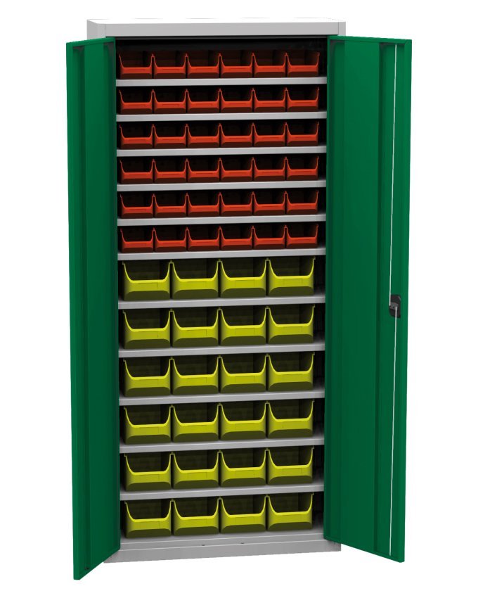 Two-door workshop cabinet with plastic boxes (45), width 950, height 1950, depth 400 mm. 9 x shelves, 25 x plastic box 456209 (w.150 x h.125 x d.235 mm), 20 x plastic box 456214 (w.205 x h.150 x d.352 mm). Possibility of replacing solid doors with doors with glass or wire filling. Body color RAL 7035 light gray.