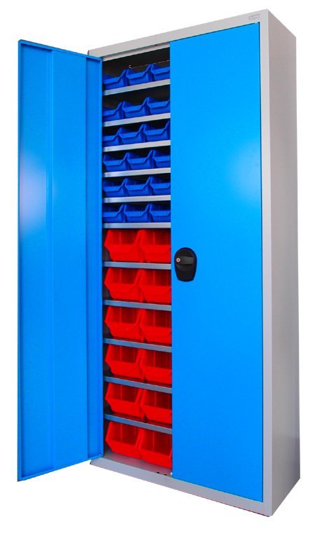 Two-door workshop cabinet with plastic boxes (45), width 950, height 1950, depth 400 mm. 9 x shelves, 25 x plastic box 456209 (w.150 x h.125 x d.235 mm), 20 x plastic box 456214 (w.205 x h.150 x d.352 mm). Possibility of replacing solid doors with doors with glass or wire filling. Body color RAL 7035 light gray.