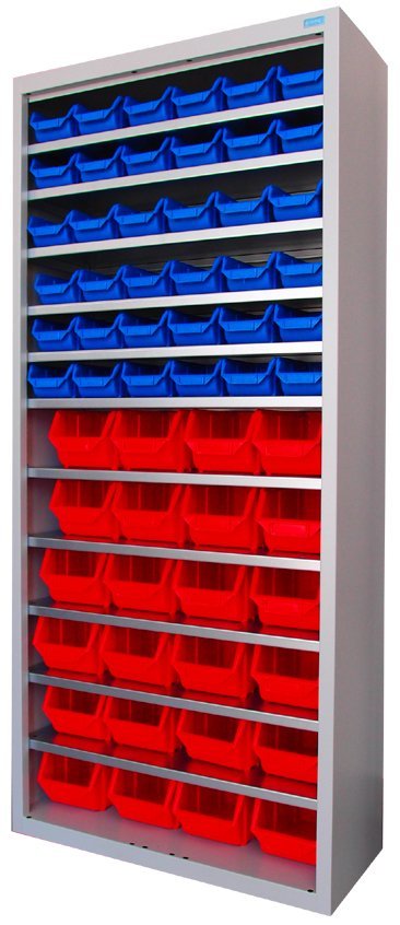 Two-door workshop cabinet with plastic boxes (60), width 750, height 1650, depth 300 mm. 11 x shelves, 36 x Small plastic box (w.110 x h.75 x d.165 mm), 24 x Medium plastic box (w.155 x h.125 x d.240 mm). Possibility of replacing solid doors with doors with glass or wire filling. In stock in light gray body, blue solid doors, blue and red boxes.